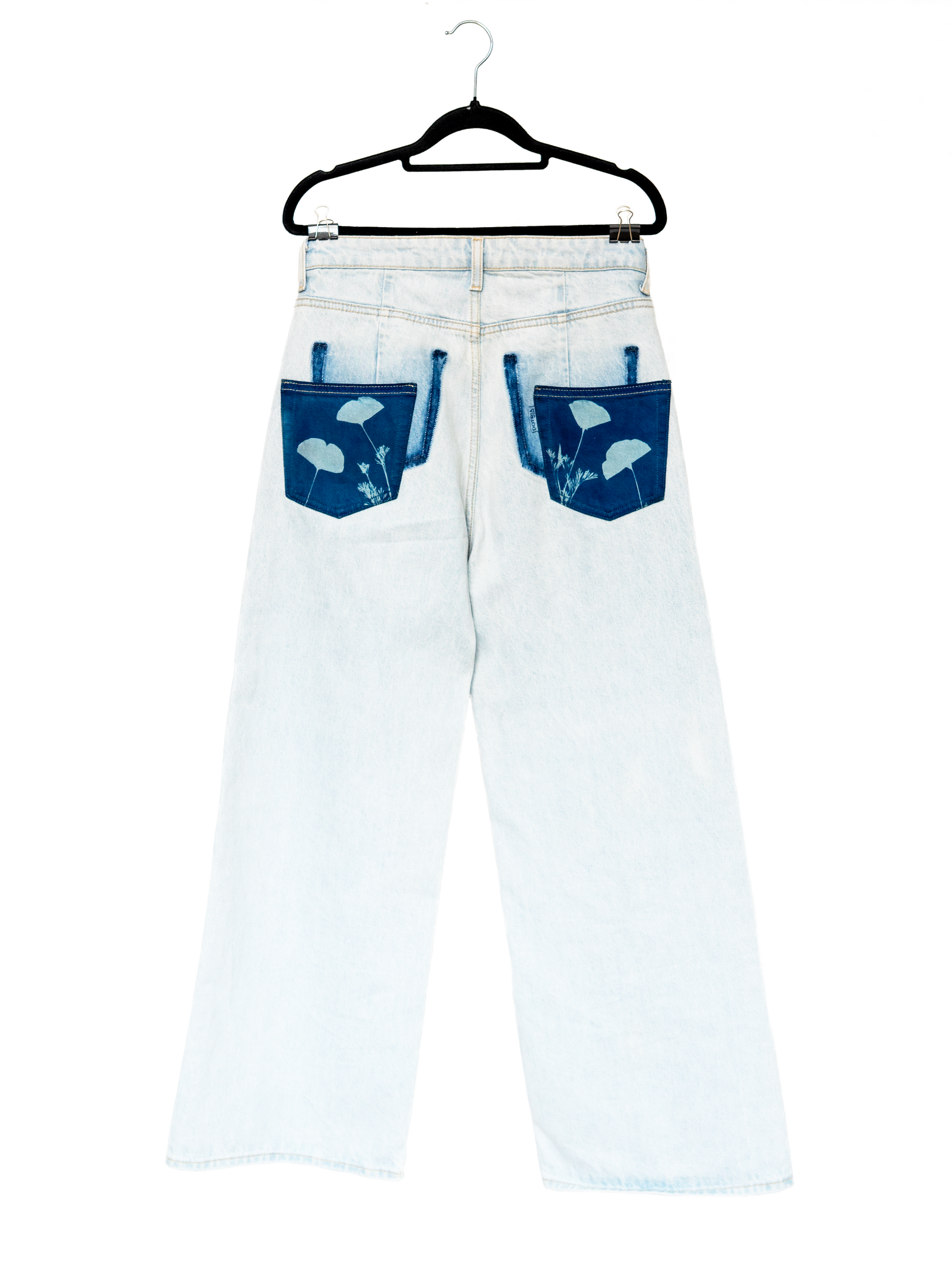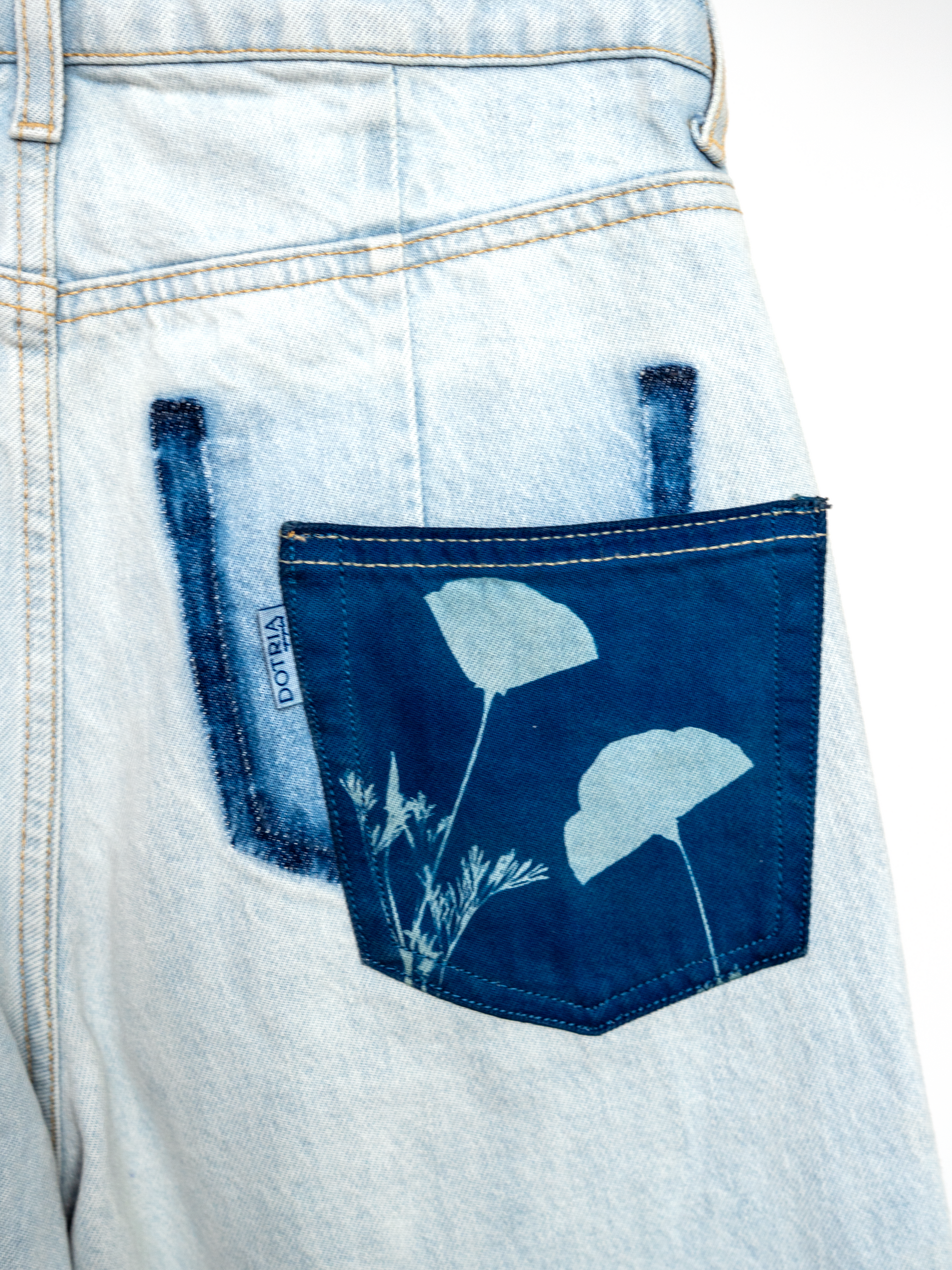 Nadruki wykonane metodą cyjanotypii są delikatne — z biegiem czasu i pod wpływem prania mogą tracić intensywność. To naturalny proces i część ich uroku.