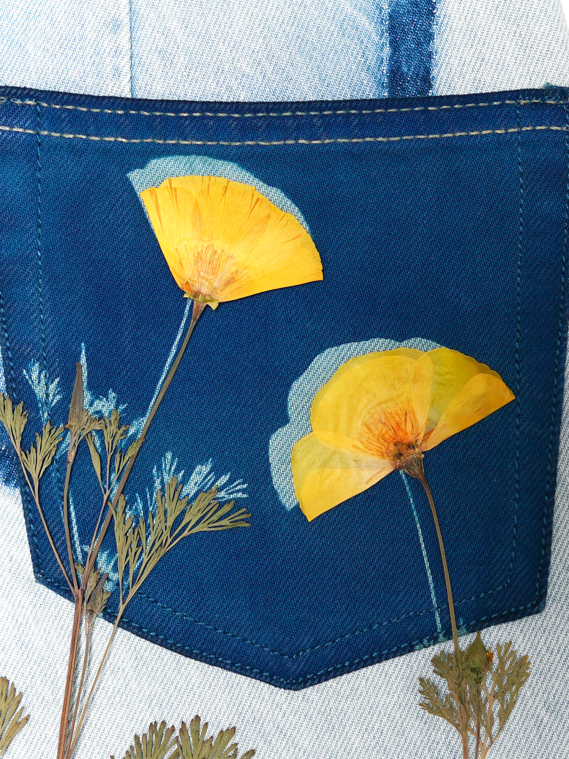 Ten egzemplarz pochodzi z upcyklingu: to ubranie z drugiej ręki (nowe lub jak nowe), które dzięki ręcznemu malowaniu żywymi roślinami techniką cyjanotypii oraz elementom patchworku otrzymało drugie życie i niepowtarzalny charakter. To unikat, dostępny tylko w jednym egzemplarzu — jak dzieło sztuki.