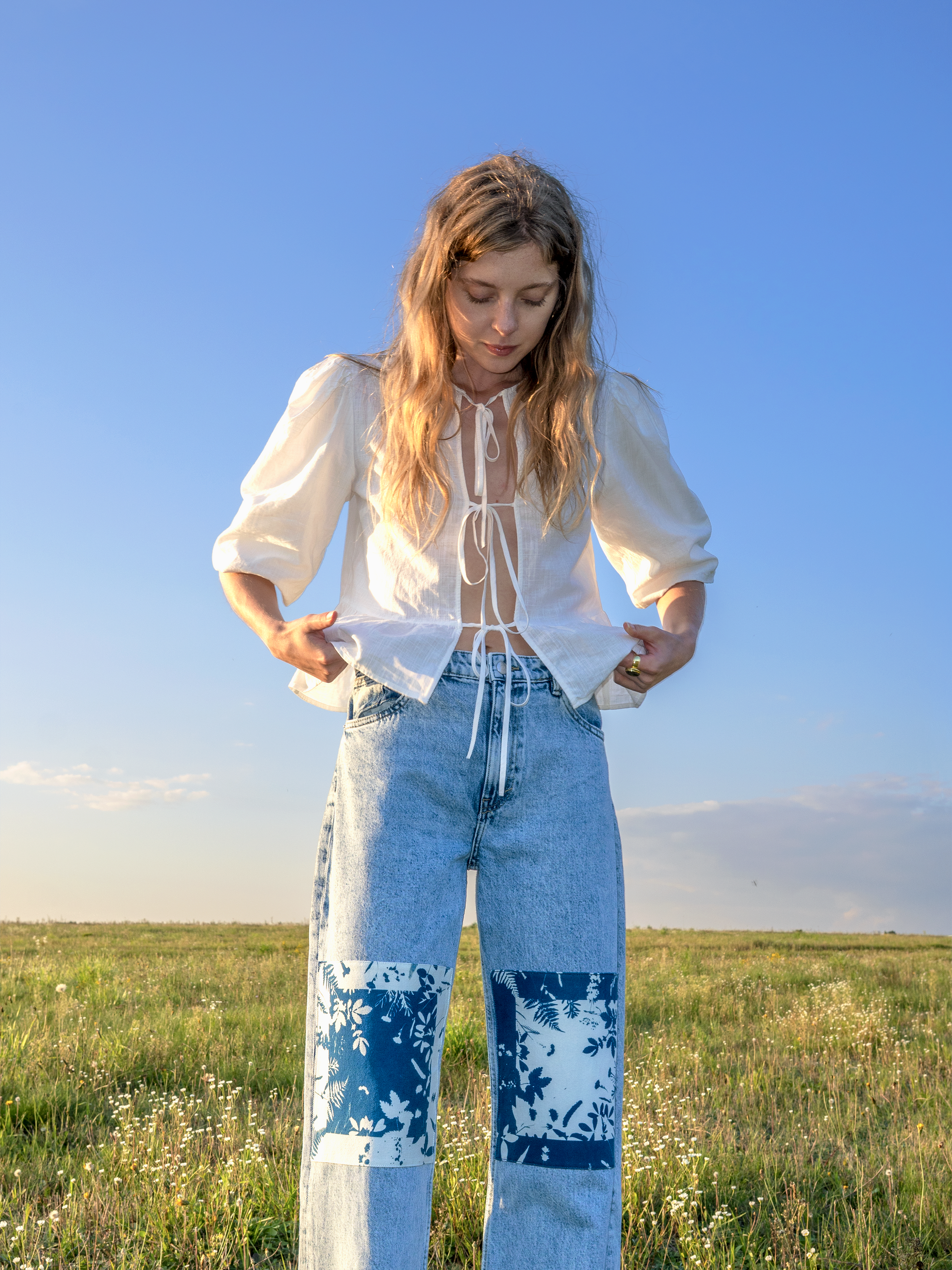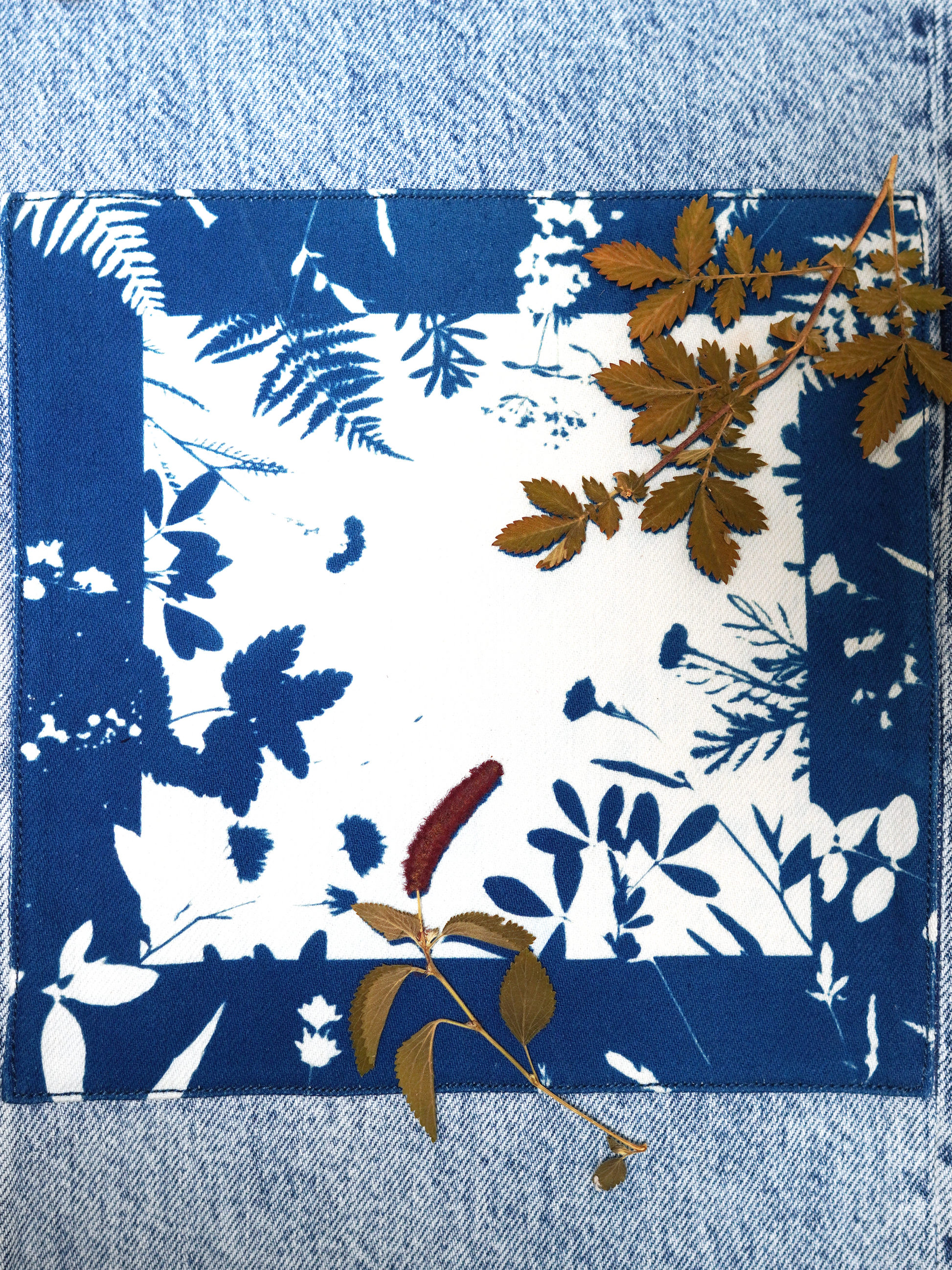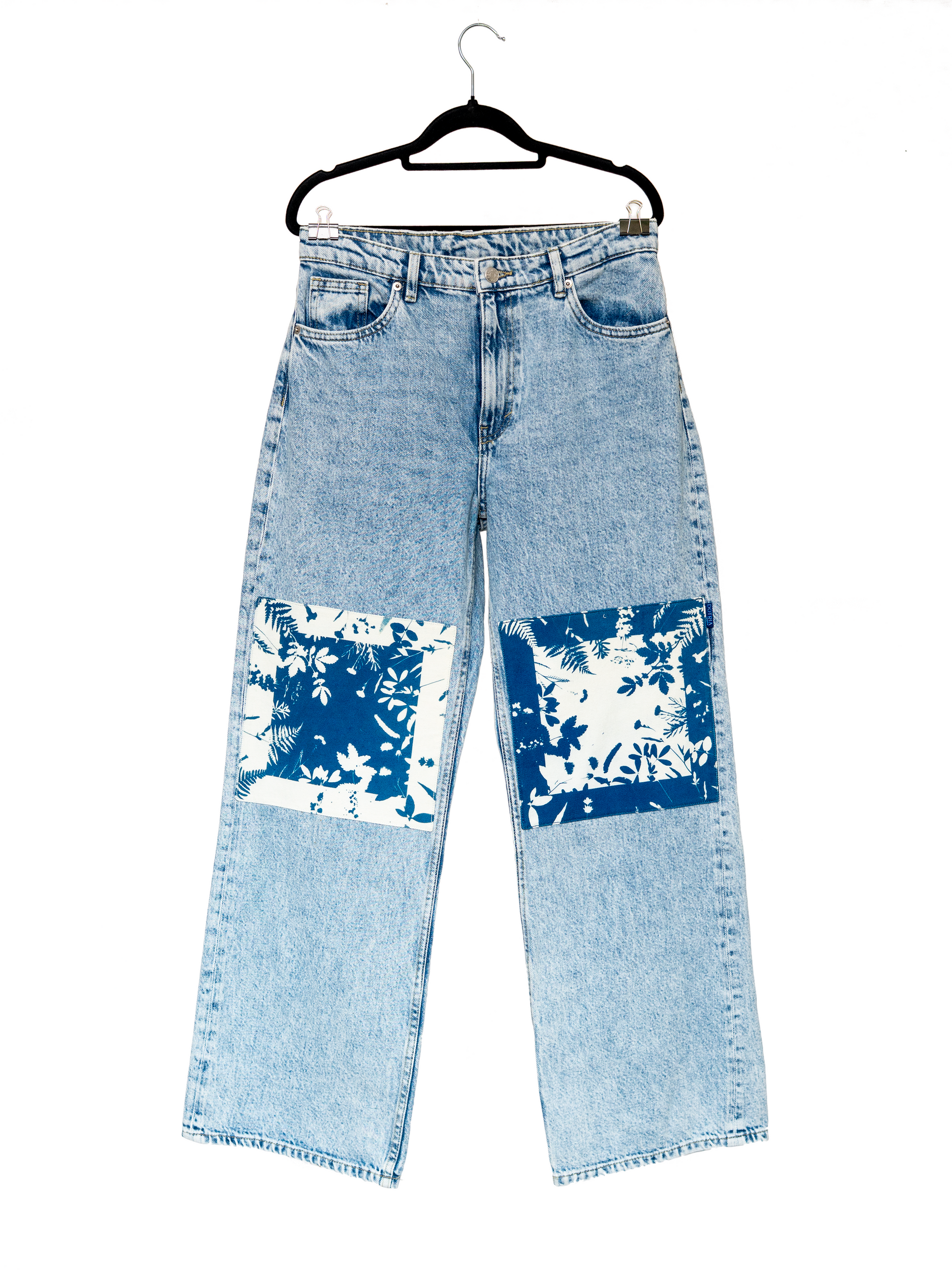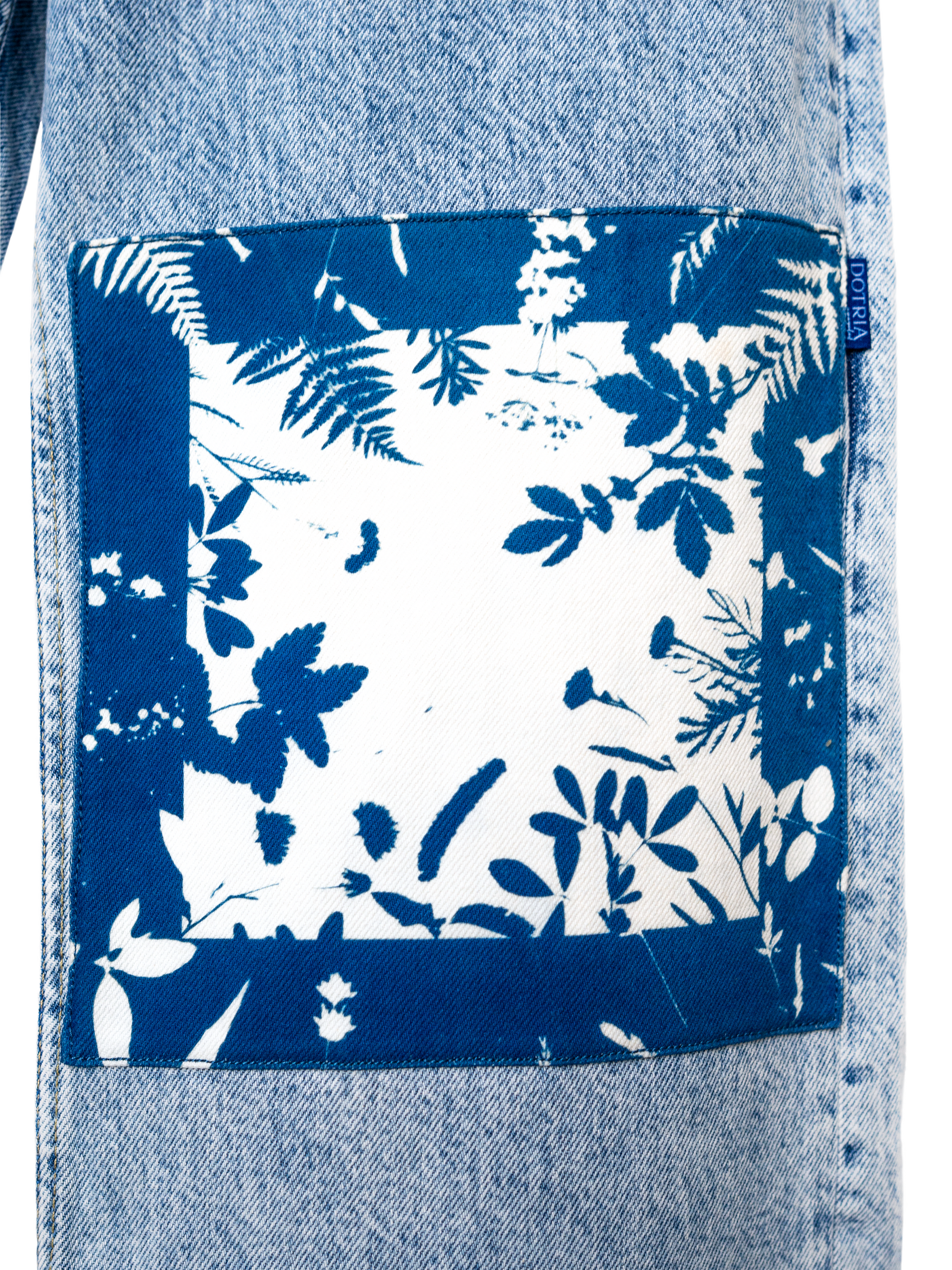 Ten egzemplarz pochodzi z upcyklingu: to ubranie z drugiej ręki (nowe lub jak nowe), które dzięki ręcznemu malowaniu żywymi roślinami techniką cyjanotypii oraz elementom patchworku otrzymało drugie życie i niepowtarzalny charakter. To unikat, dostępny tylko w jednym egzemplarzu — jak dzieło sztuki.