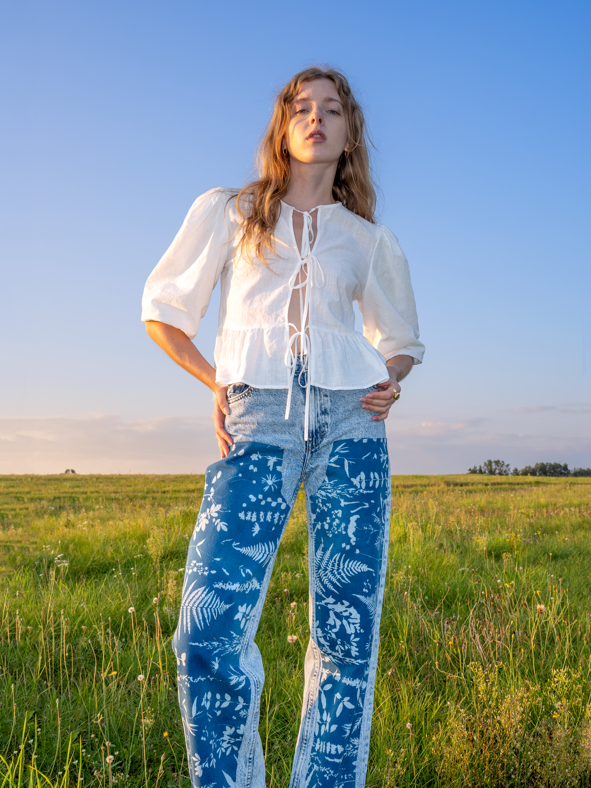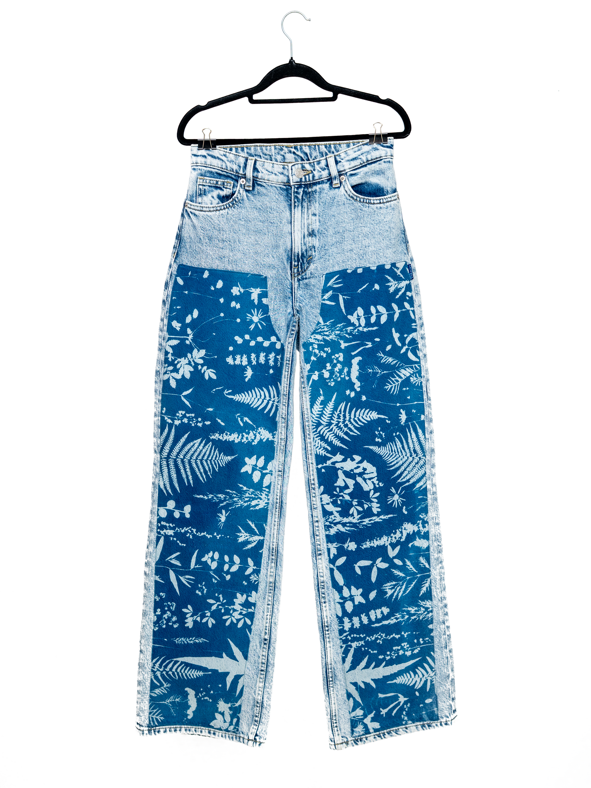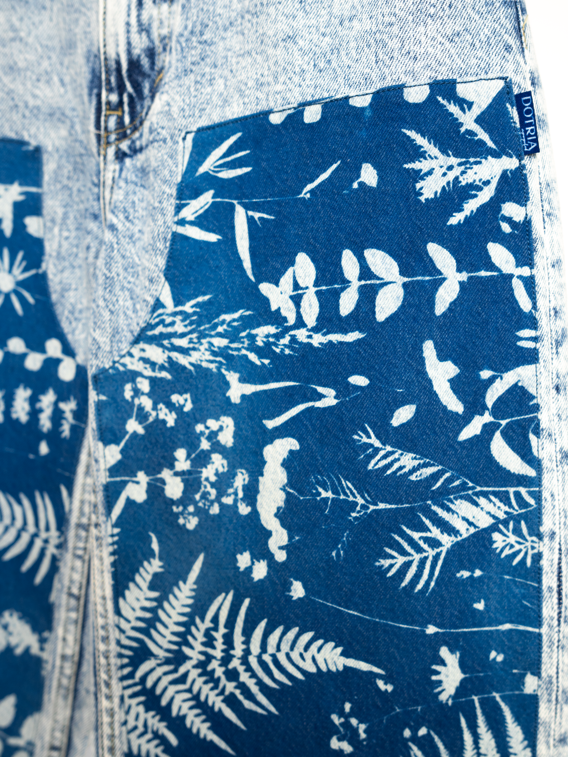 Ten egzemplarz pochodzi z upcyklingu: to ubranie z drugiej ręki (nowe lub jak nowe), które dzięki ręcznemu malowaniu żywymi roślinami techniką cyjanotypii oraz elementom patchworku otrzymało drugie życie i niepowtarzalny charakter. To unikat, dostępny tylko w jednym egzemplarzu — jak dzieło sztuki.