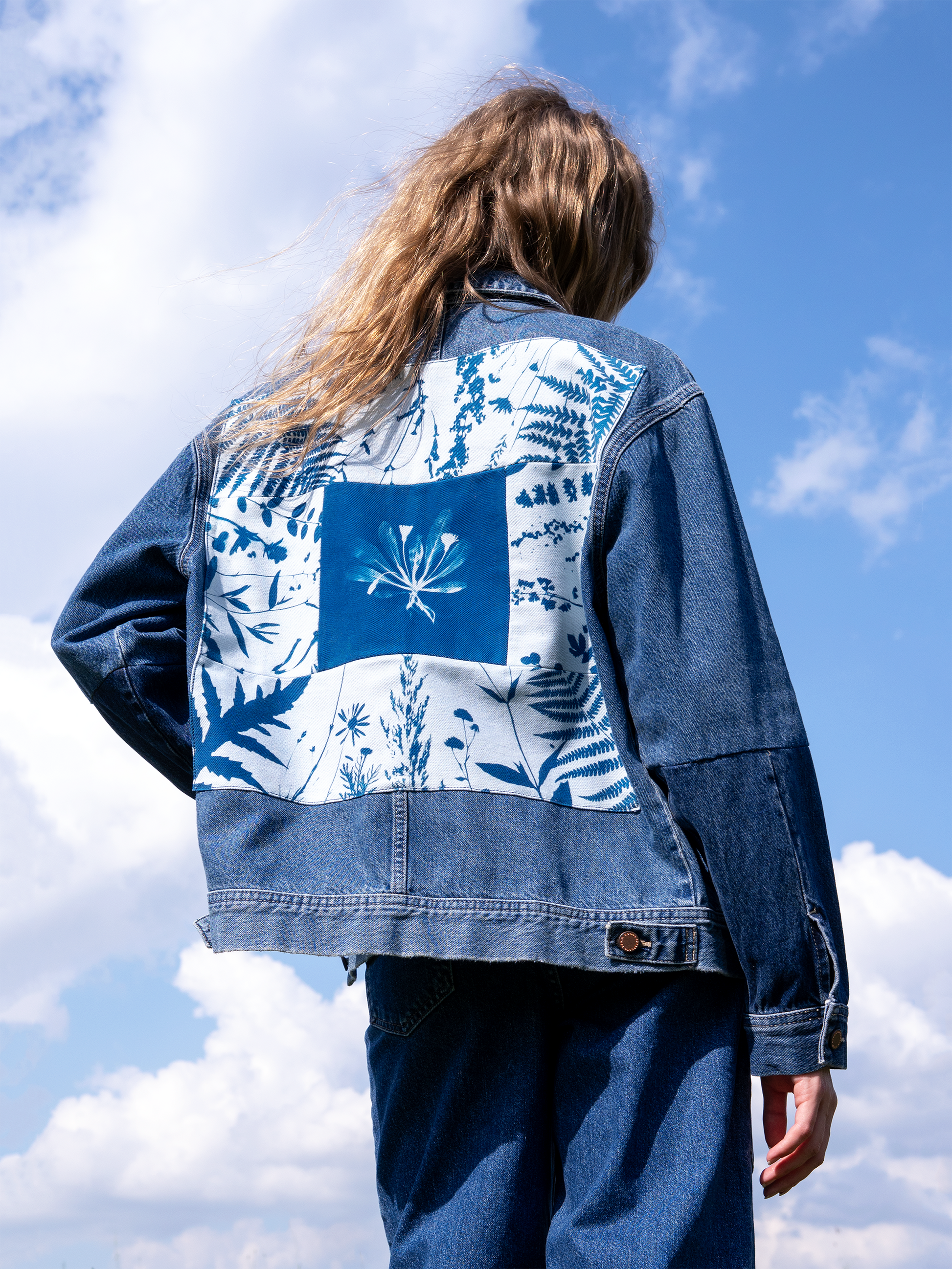Ten egzemplarz pochodzi z upcyklingu: to ubranie z drugiej ręki (nowe lub jak nowe), które dzięki ręcznemu malowaniu żywymi roślinami techniką cyjanotypii oraz elementom patchworku otrzymało drugie życie i niepowtarzalny charakter. To unikat, dostępny tylko w jednym egzemplarzu — jak dzieło sztuki.