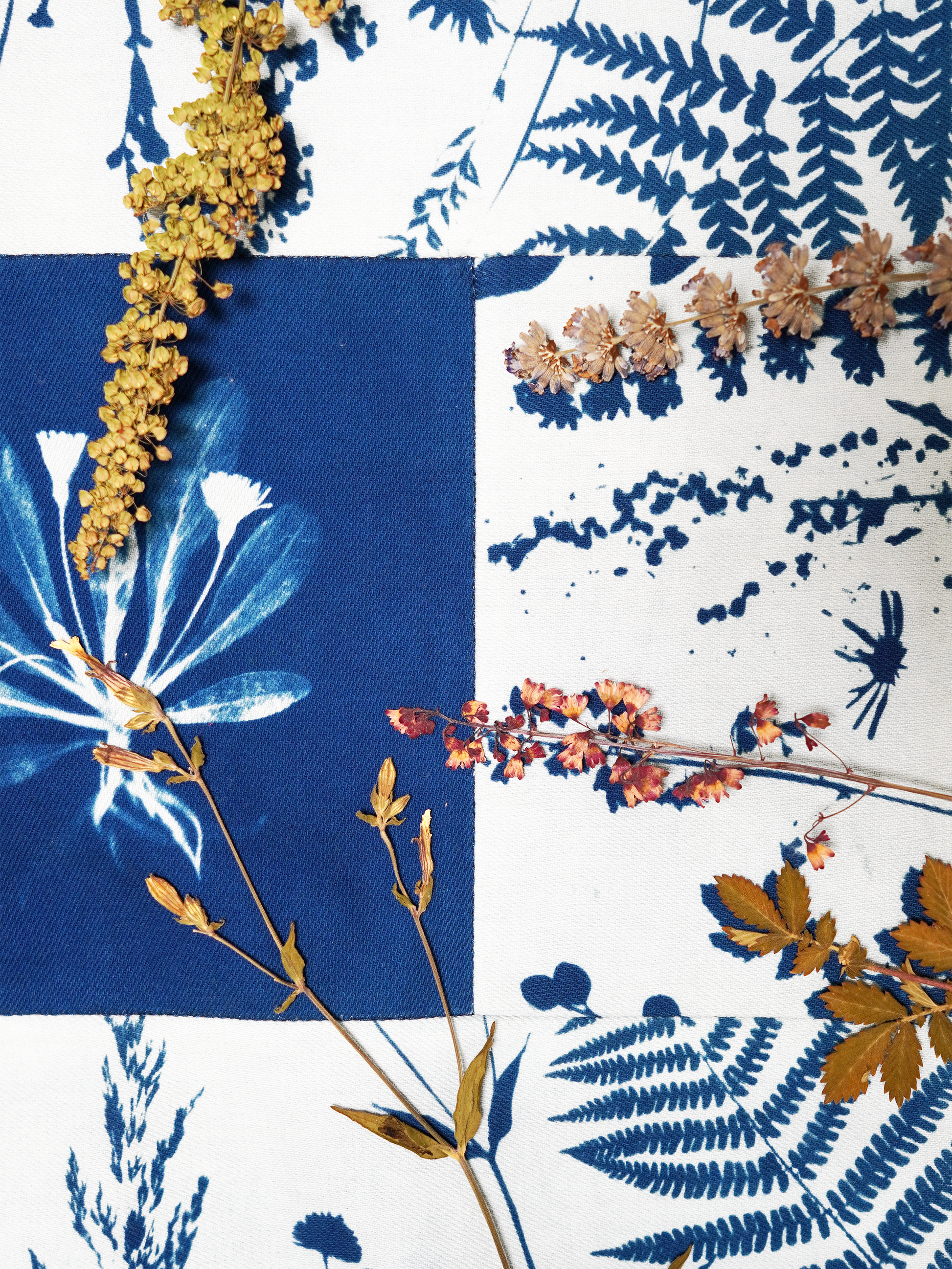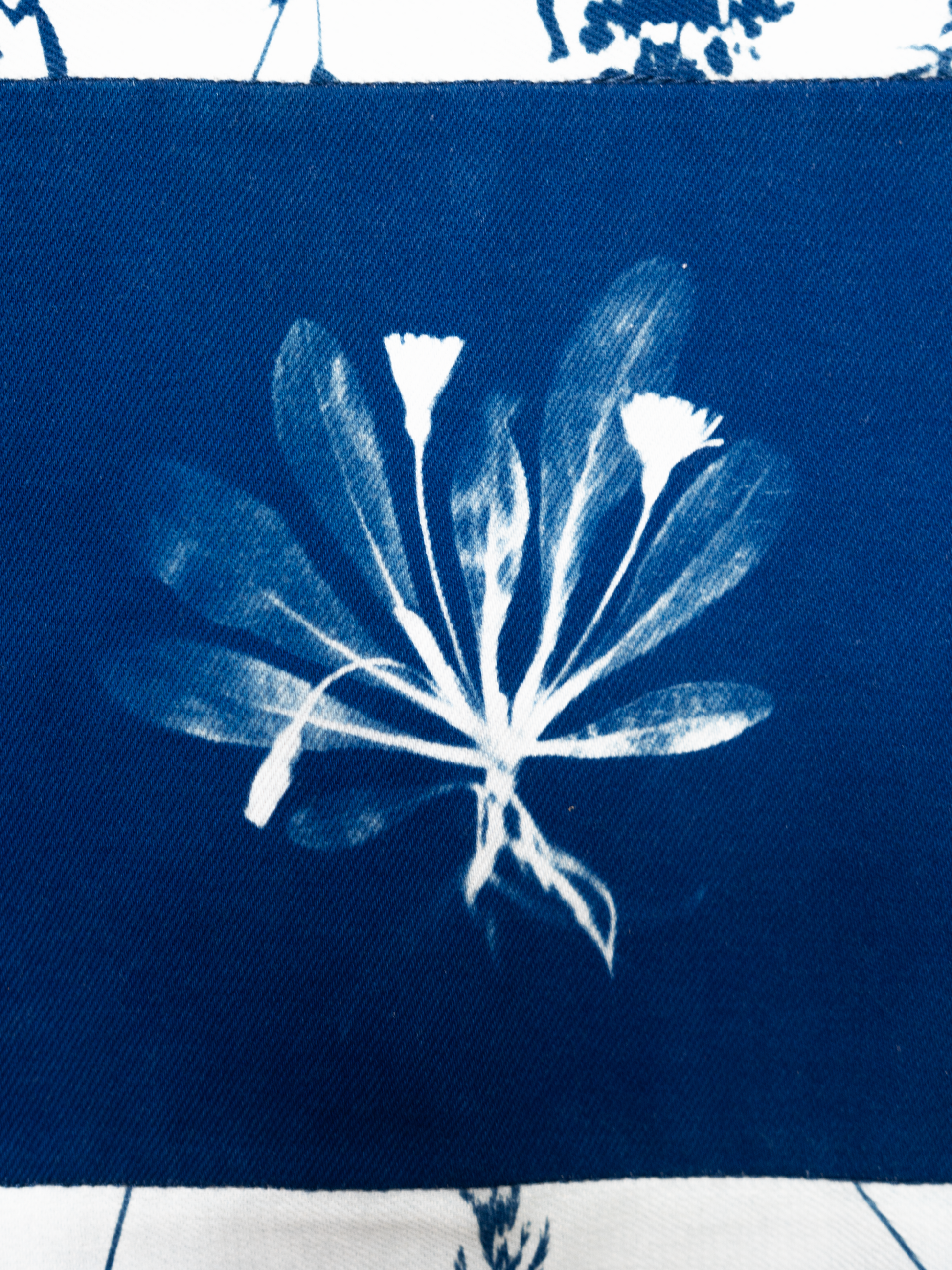 Nadruki wykonane metodą cyjanotypii są delikatne — z biegiem czasu i pod wpływem prania mogą tracić intensywność. To naturalny proces i część ich uroku.